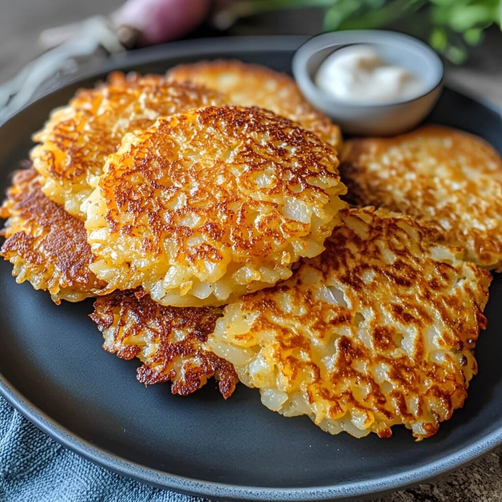 - For each pancake, drop a heaping tablespoon of the potato mixture into the hot oil, flattening it slightly with the back of the spoon. Fry until the edges are golden brown and crispy, about 3-4 minutes per side. Flip and cook the other side until golden brown.